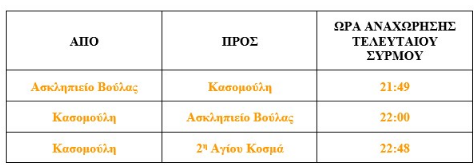 Υπενθυμίζεται ότι δρομολόγια πραγματοποιούνται μόνο στο τμήμα Κασομούλη – Ασκλ. Βούλας.