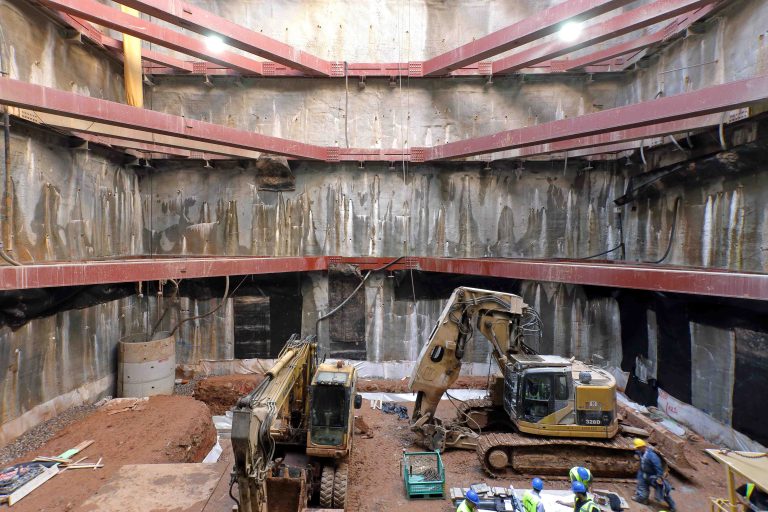 Σταθμός Δικαστήρια: Στον σταθμό Δικαστήρια κατασκευάζονται τα αγκύρια του 1ου επιπέδου εκσκαφής και η πρόοδος κατασκευής κεφαλόδεσμου του κυρίως ορύγματος έχει φτάσει το 93,7%.