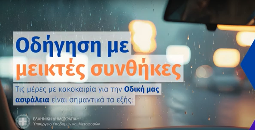 Ενημερωτικό βίντεο με χρήσιμες συμβουλές για την οδική ασφάλεια, στο πλαίσιο των μέτρων προστασίας οδηγών και επιβατών σε συνθήκες κακοκαιρίας, κοινοποίησε το Υπουργείο Υποδομών και Μεταφορών.