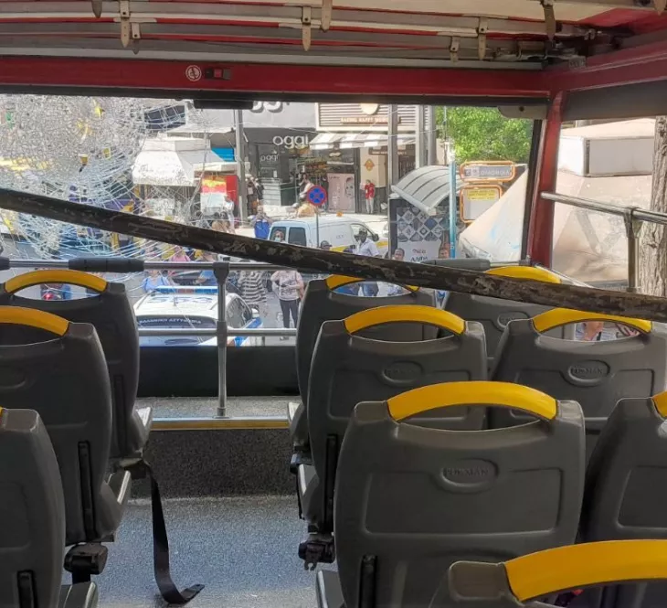 Το τουριστικό λεωφορείο προσέκρουσε στην κεραία του Τρόλεϊ με αποτέλεσμα αυτή να σπάσει και τμήμα της να προκαλέσει θραύση ενός υαλοπίνακα στο όροφο του λεωφορείου.